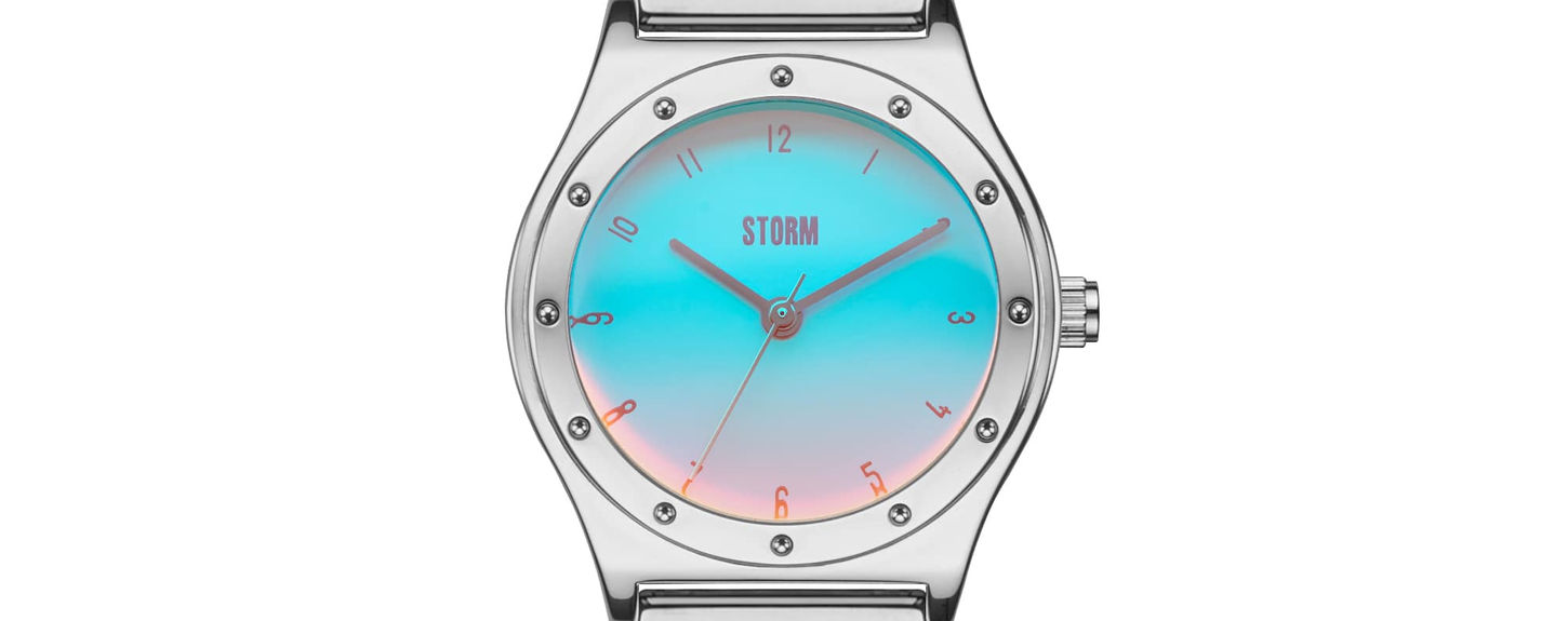 Die STORM Marlena kombiniert polierten Edelstahl mit dem charakteristischen, irisierenden Lazer-Aqua-Glas von STORM. Das Halbspangen-Armband und zwölf Stahl-Nietenmarkierungen verleihen ihr eine moderne, kantige Eleganz. Bis 50 m wasserdicht – ein ausdrucksstarkes Accessoire für jeden Tag.